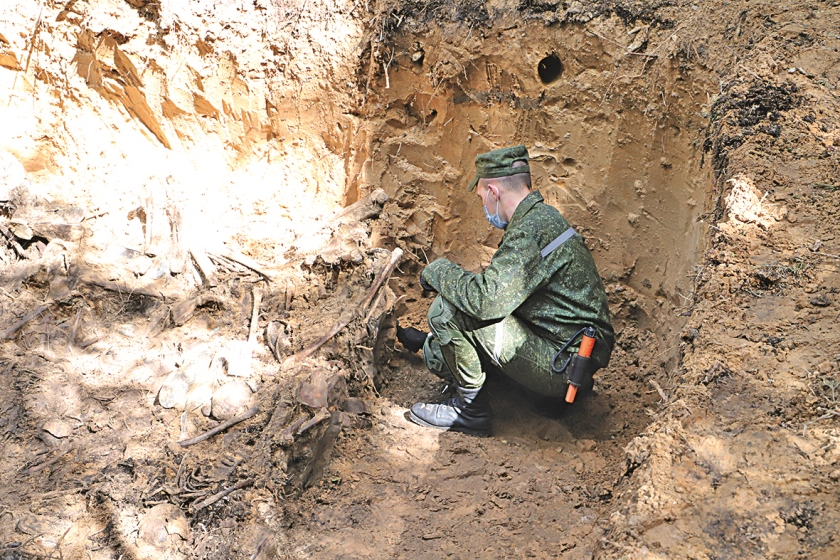 — Это место далось нам тяжело. Мы 2 года работали над ним, — рассказал журналистам прокурор Витебской области Андрей Скурат, прибывший сюда для ознакомления с ходом работ. — Изучали архивные документы, акты Чрезвычайной государственной комиссии (ЧГК. —Прим. авт.). Была небольшая путаница в географии. И вот благодаря помощи 52-го поискового батальона, полученным аэрофотоснимкам Люфтваффе оккупационного периода нам наконец удалось установить это место уничтожения мирного населения. По той версии, которая у нас на сегодняшний день есть, здесь в 1941 году уничтожались семьи бойцов-красноармейцев, полоцкого актива.