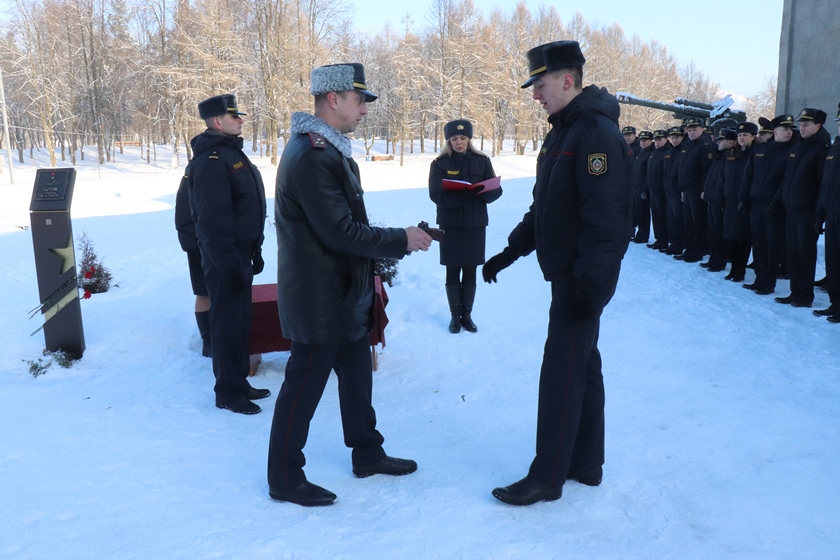 В Полоцком РОВД проведено мероприятие, приуроченное к Году исторической памяти. Молодым сотрудникам, прибывшим для дальнейшего прохождения службы, в торжественной обстановке вручили табельное оружие.