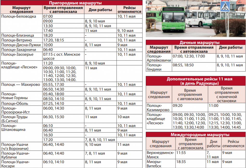 С 8 по 11 мая автобусы филиала «Автобусный парк №2 г.Полоцка» на пригородных и междугородных маршрутах будут выполнять рейсы по расписанию согласно дням недели со следующими изменениями: