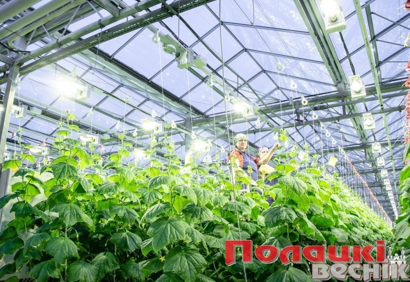 Здесь, как рассказал управляющий тепличным хозяйством Юрий Ахрамёнок, на площади 4 га выращивают огурцы, томаты и зеленную продукцию. Попав в «огуречное царство» (а это территория в 1,4 га), почувствовала себя лилипутом в стране гулливеров — многометровых стеблей, увешанных плодами. Созданный здесь микроклимат очень нравится огурцам, которые дают солидный урожай. Работа кипит: овощеводы собирают и затаривают продукцию, водители на электрокарах отвозят ее на склад, а там идет подсчет килограммов…
