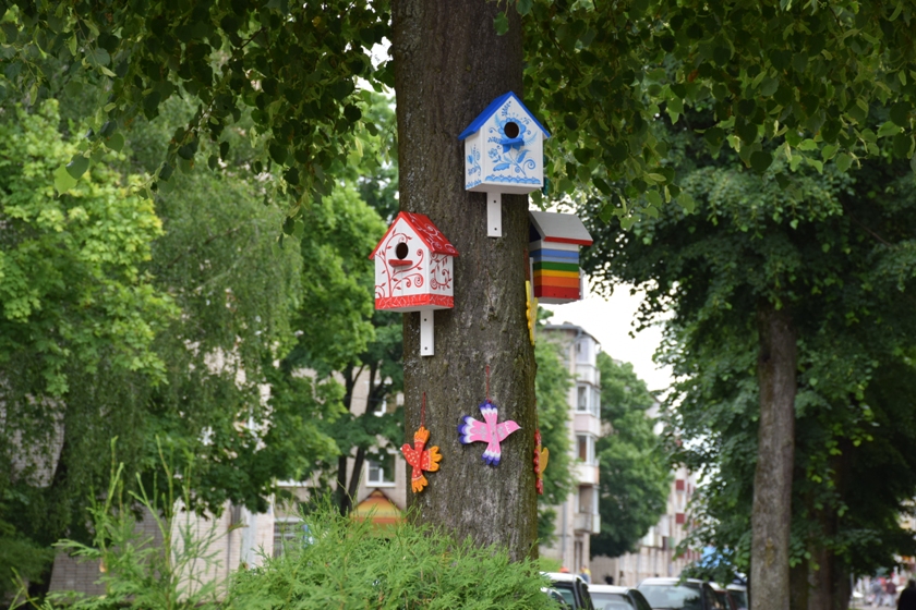 Необычный яркий акцент появился и на улице Франциска Скорины, возле Полоцкого районного Центра детей и молодежи. Здесь внимание прохожих привлекают симпатичные красочные скворечники и декоративные разноцветные птички, которыми украшены липы, которые растут возле входа в учреждение. Творческими и мастеровыми сотрудниками Центра в эту яркую композицию заложена чудесная объединяющая идея.