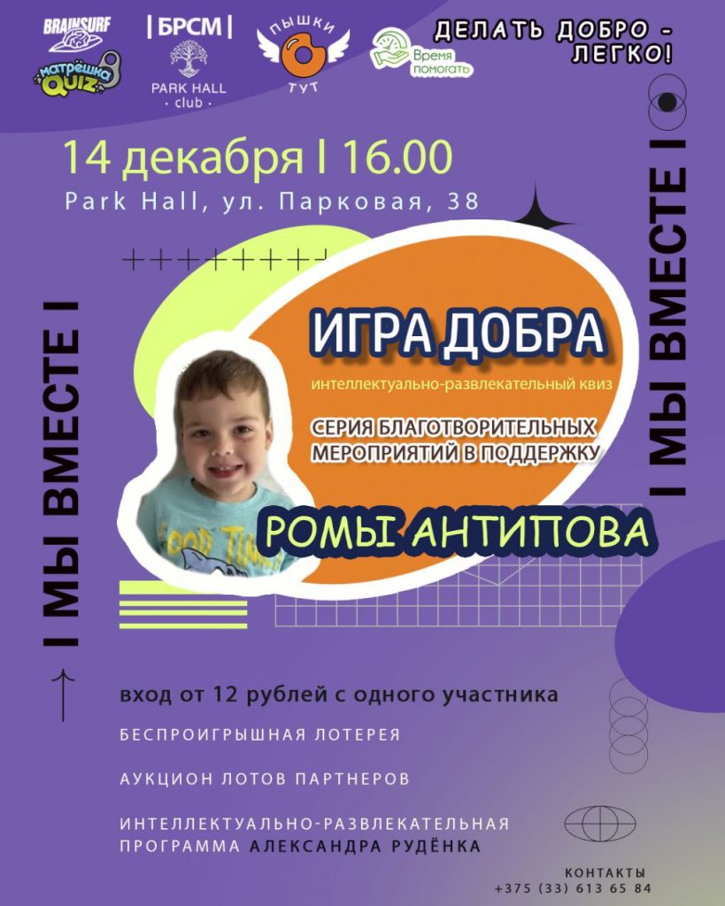 Завершающее мероприятие, в рамках благотворительного цикла в поддержку маленького полочанина Ромы Антипова, пройдет в Новополоцке.
