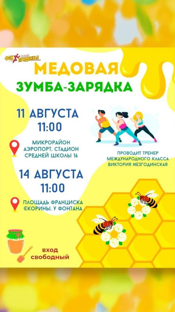 Сегодня жители и гости Полоцка имеют уникальную возможность начать свой день с заряда бодрости, позитива и, конечно же, сладости! В городе пройдет медовая зумба-зарядка, событие, которое обещает превратить обычную утреннюю тренировку в настоящий праздник.